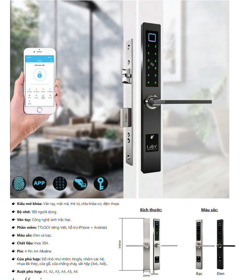 Với giá thành rẻ và có phân khúc trải dài từ bình dân đến cao cấp, hãng khóa cửa vân tay Laffer có đủ dòng sản phẩm cho người dùng lựa chọn lắp mới hoặc thay thế khóa cửa như nhôm xingfa, nhôm các hệ, sắt hộp, cửa gỗ căn hộ, cửa chống cháy chung cư, cửa phòng ngủ, cửa gỗ biệt thự, cổng rào ngoài trời, cửa kính cường lực, khóa chuyên cho nhà trọ, homestay, giải pháp khóa cửa khách sạn…